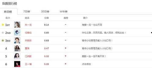 你知道吗?最近娱乐圈可是热闹非凡,各大明星榜排名轮番上演,让人眼花缭乱。今天,就让我带你一起揭秘这些明星们的排名之谜,看看谁才是真正的流量担当!